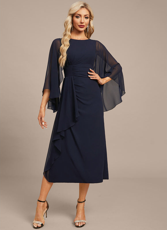 Cette robe n'est pas qu'un vêtement, c'est une déclaration de style. Les manches évasées en mousseline, légères comme une caresse, ajoutent un mouvement aérien et une touche de mystère, tandis que les volants subtilement placés sur le côté créent un drapé flatteur, dissimulant astucieusement la fente sur la jambe pour une allure à la fois sensuelle et raffinée. Le col rond classique assure une élégance discrète, et grâce à son soutien-gorge intégré, vous bénéficiez d'un confort et d'un maintien parfaits sans compromettre l'esthétique. Chaque détail de cette robe a été pensé pour vous offrir une confiance inébranlable et une présence captivante, vous permettant de briller de mille feux.