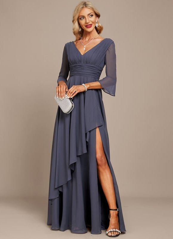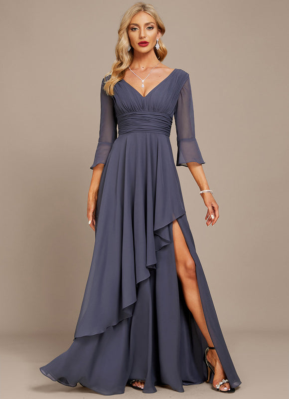 Chaque détail de cette robe a été pensé pour sublimer votre silhouette. Son élégant col en V mettra en valeur votre décolleté avec subtilité, tandis que le dos en V assorti ajoute une touche de sophistication inattendue. La coupe trapèze fluide, ornée de volants délicats, crée un mouvement gracieux et aérien à chacun de vos pas, vous donnant l'impression de flotter. La fente audacieuse sur la jambe révèle juste ce qu'il faut de peau, ajoutant une touche de glamour et de sensualité sans effort. De plus, avec son soutien-gorge intégré, cette robe vous offre un maintien parfait et une tranquillité d'esprit, vous permettant de profiter pleinement de votre soirée.
