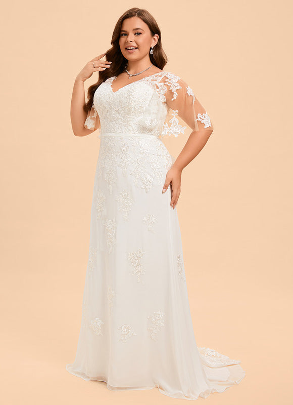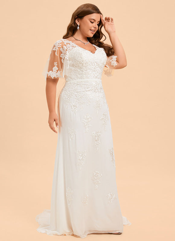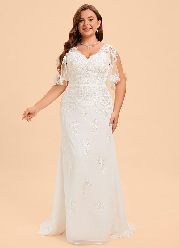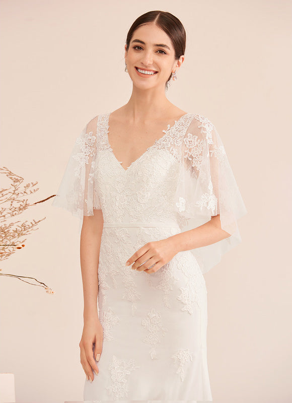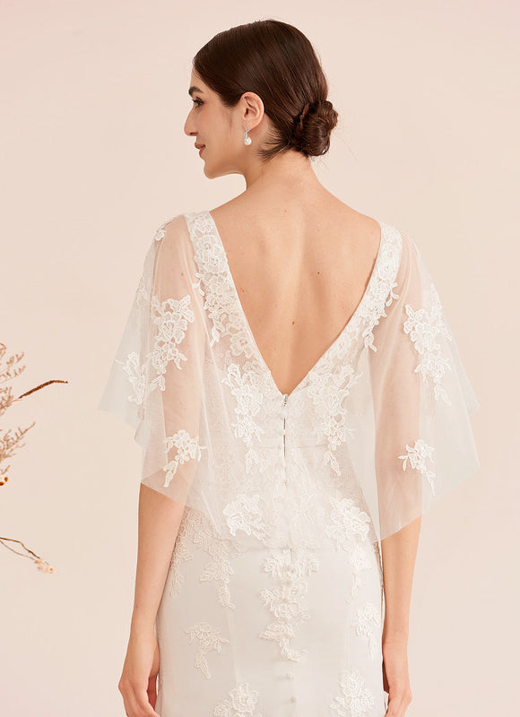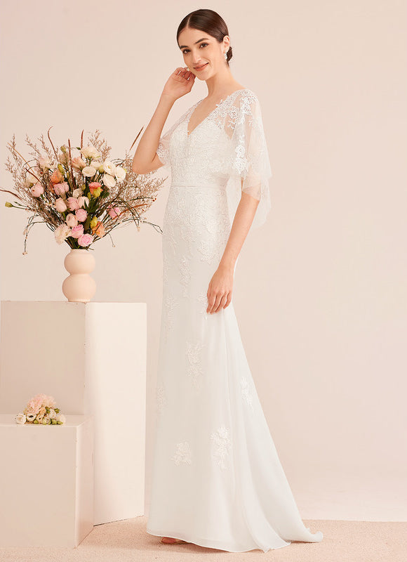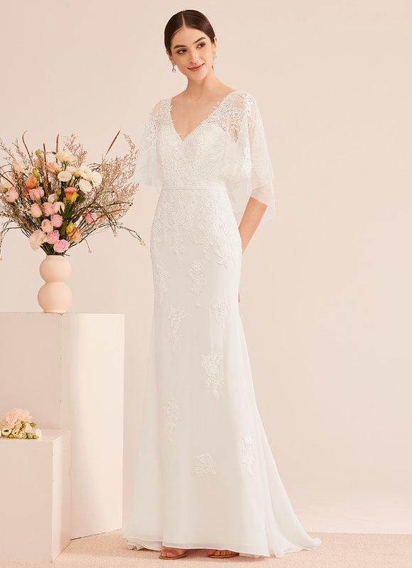 Cette pièce maîtresse est confectionnée en mousseline légère, offrant une sensation de douceur sur la peau et un tombé impeccable qui suit chacun de vos mouvements. La forme sirène met en valeur vos courbes avec sophistication, tandis que le col en V apporte une touche de féminité et d'élégance discrète. Les manches longues voilées, ornées de délicates applications de dentelle, ajoutent une dimension éthérée et romantique à l'ensemble. Pour votre confort et une silhouette impeccable, la robe intègre un soutien-gorge et des armatures de maintien, assurant un ajustement parfait sans compromis. Le dos est doté d'un zip discret pour un enfilage facile et une finition nette.
