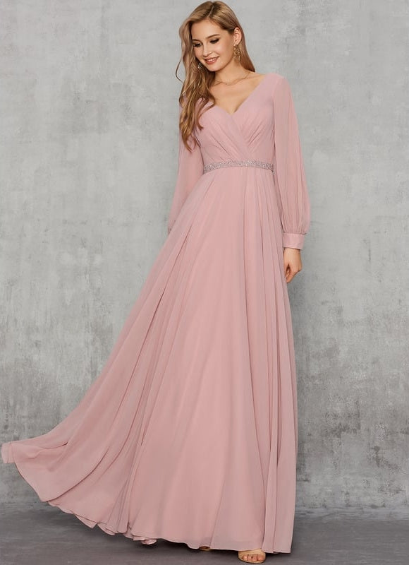 Chaque détail de cette robe a été pensé pour sublimer votre silhouette et mettre en valeur votre beauté naturelle. Son col V flatteur et son dos en V ajoutent une touche de sophistication discrète, tandis que sa coupe trapèze assure une élégance intemporelle qui convient à toutes les morphologies. Les manches longues apportent une allure gracieuse, et la ceinture perlée délicatement ornée de perles, qui marque la taille, ajoute juste ce qu'il faut de brillance pour captiver les regards. Le tissu en mousseline plissée, doux et fluide, crée un mouvement harmonieux, vous enveloppant dans un voile de légèreté et de raffinement.